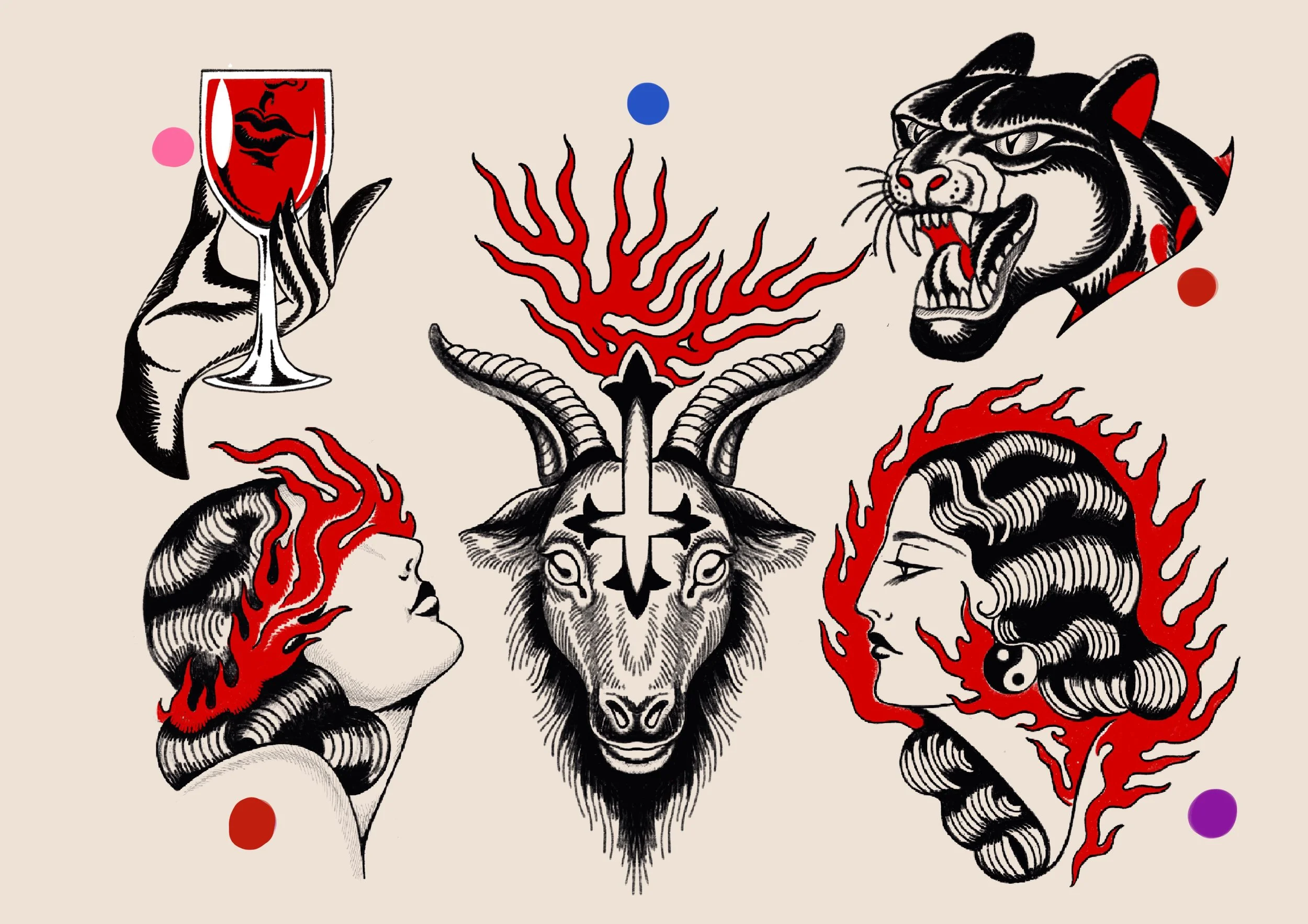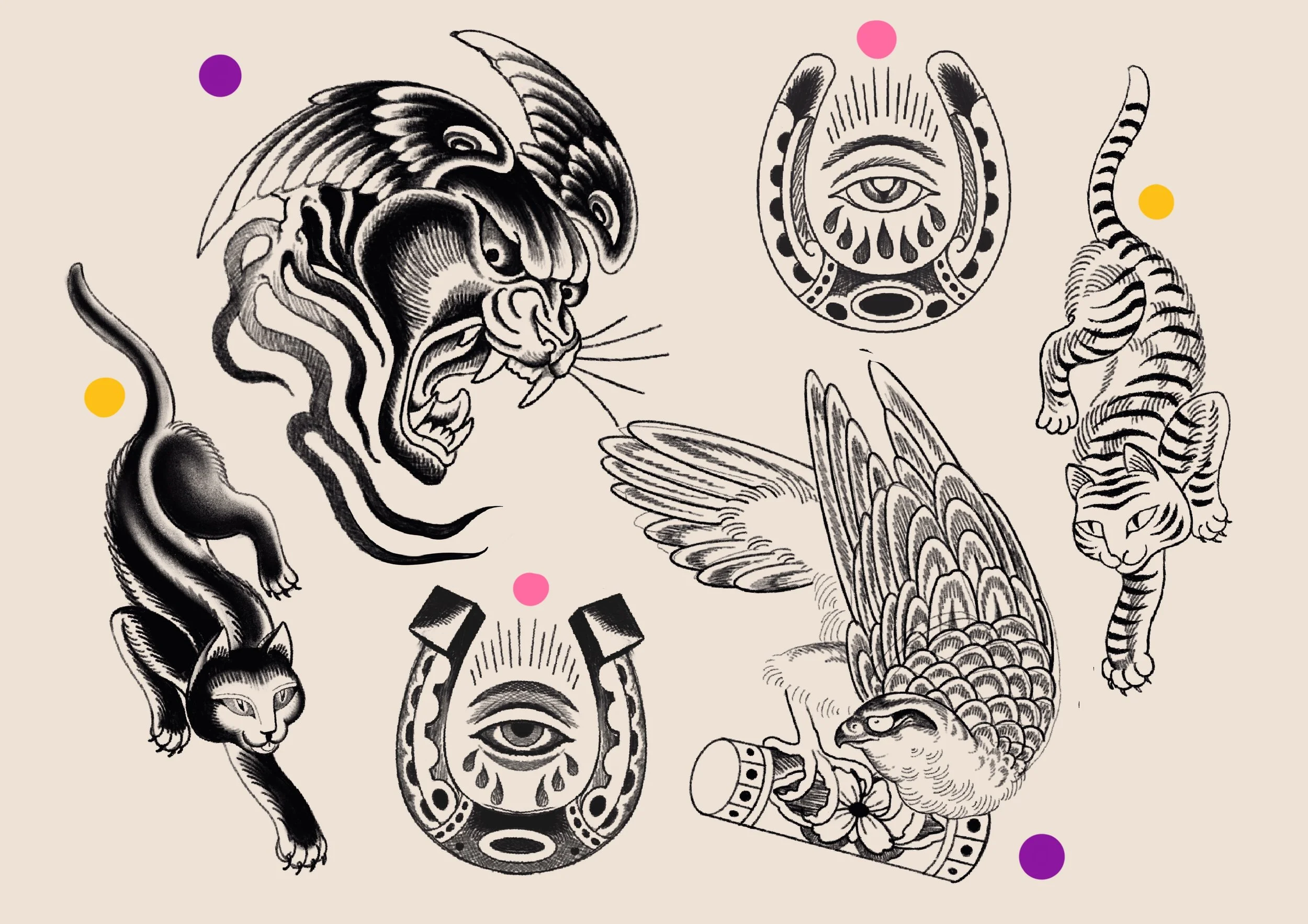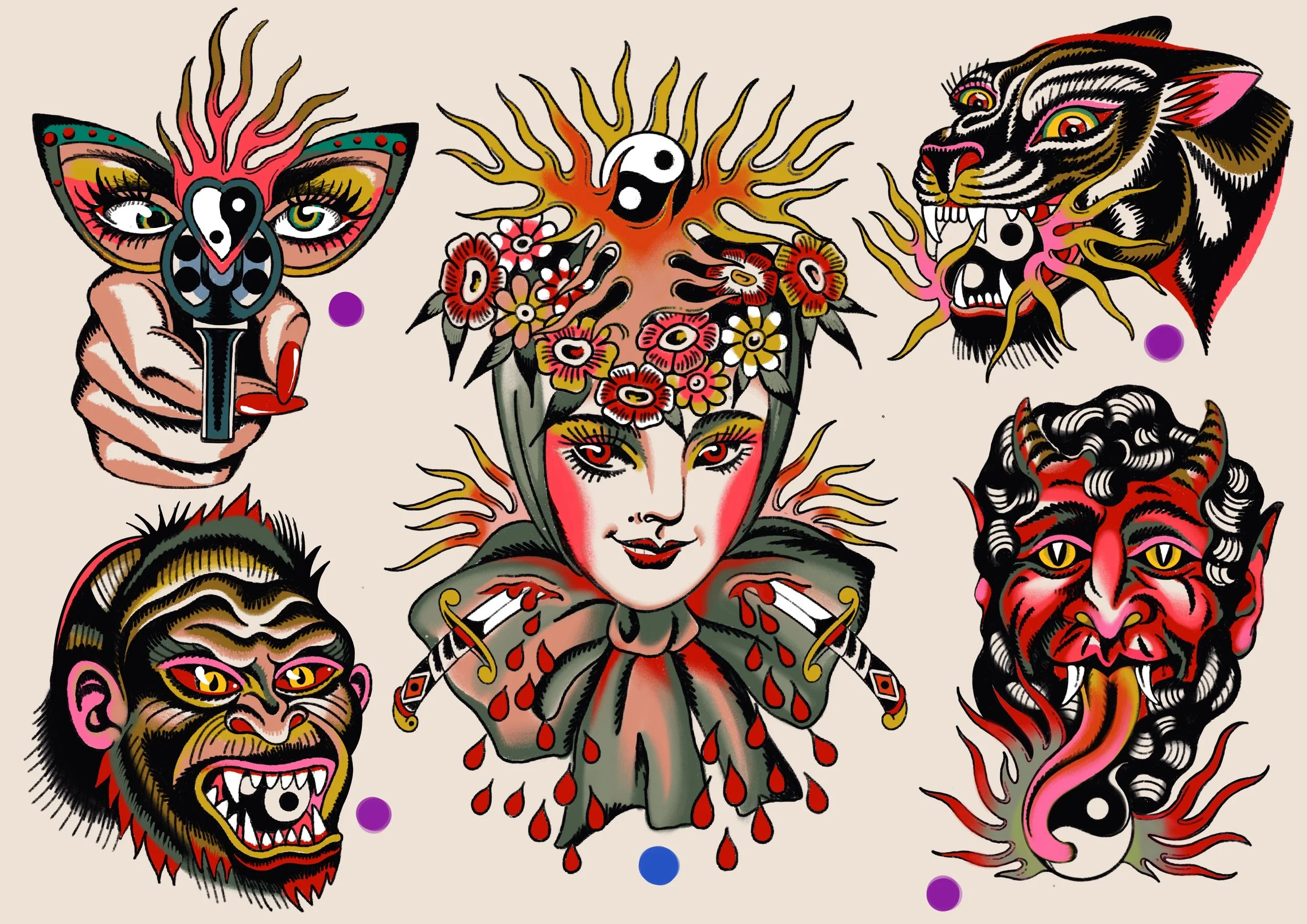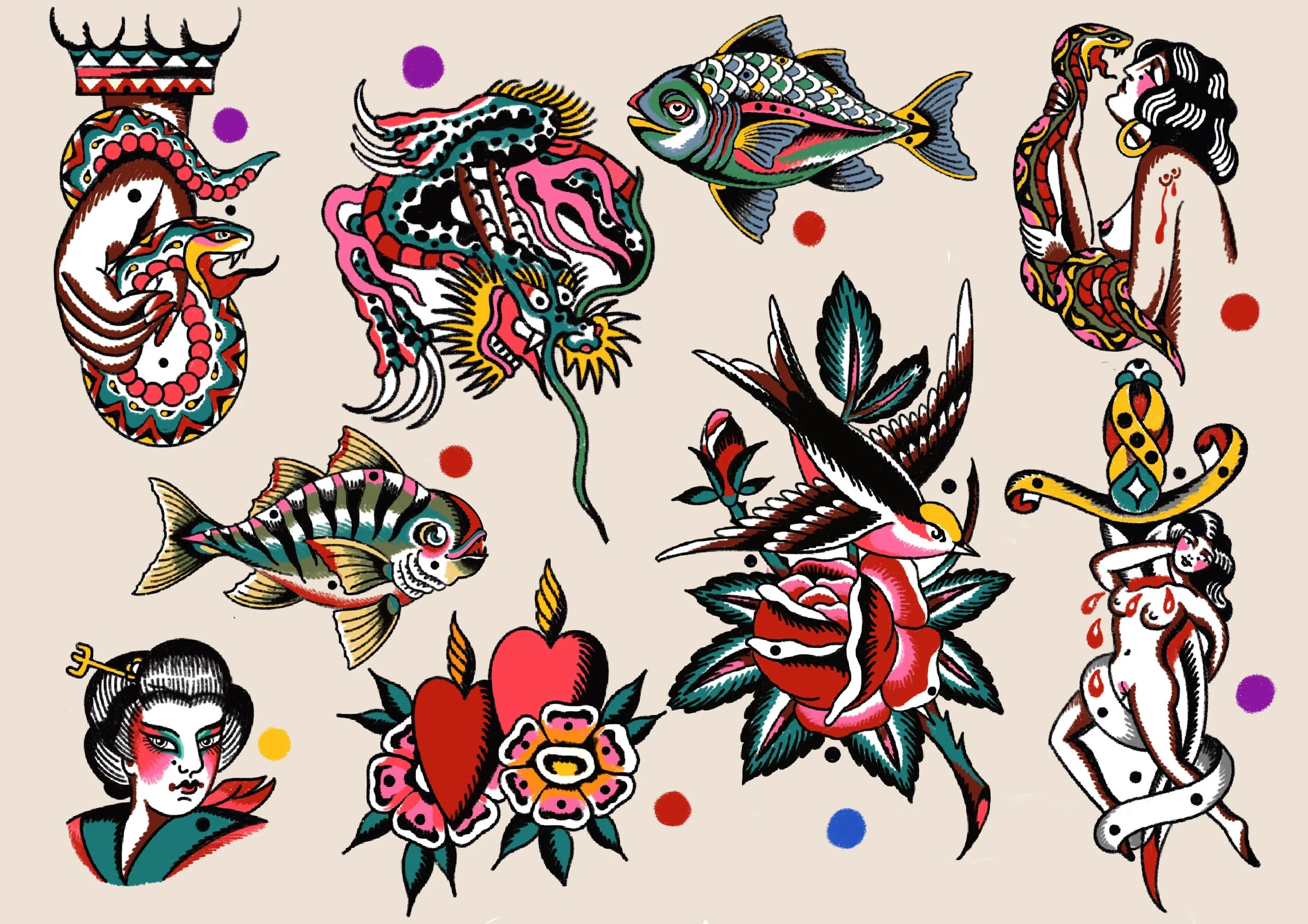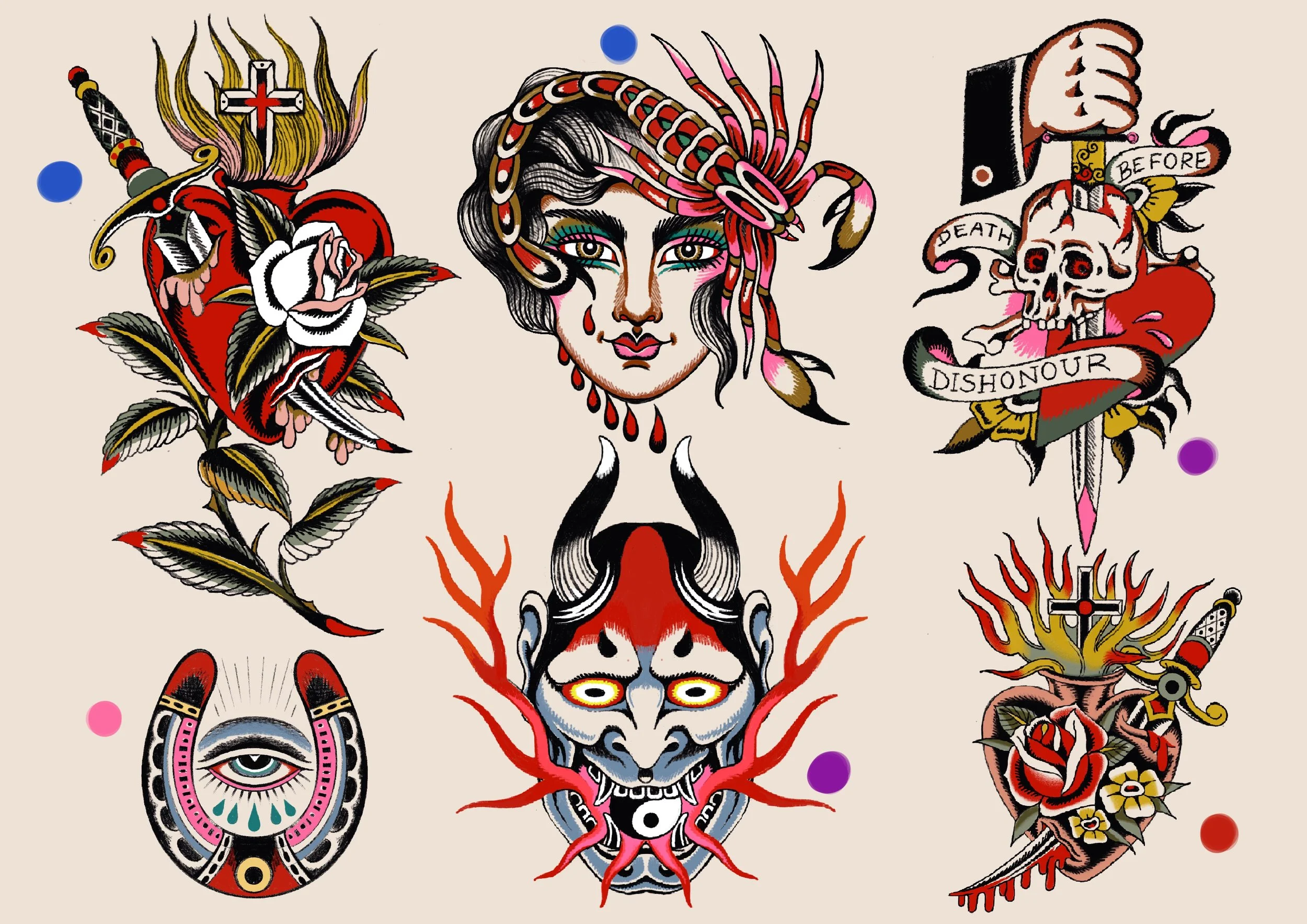 This designs can be tattooed in color or black and grey.